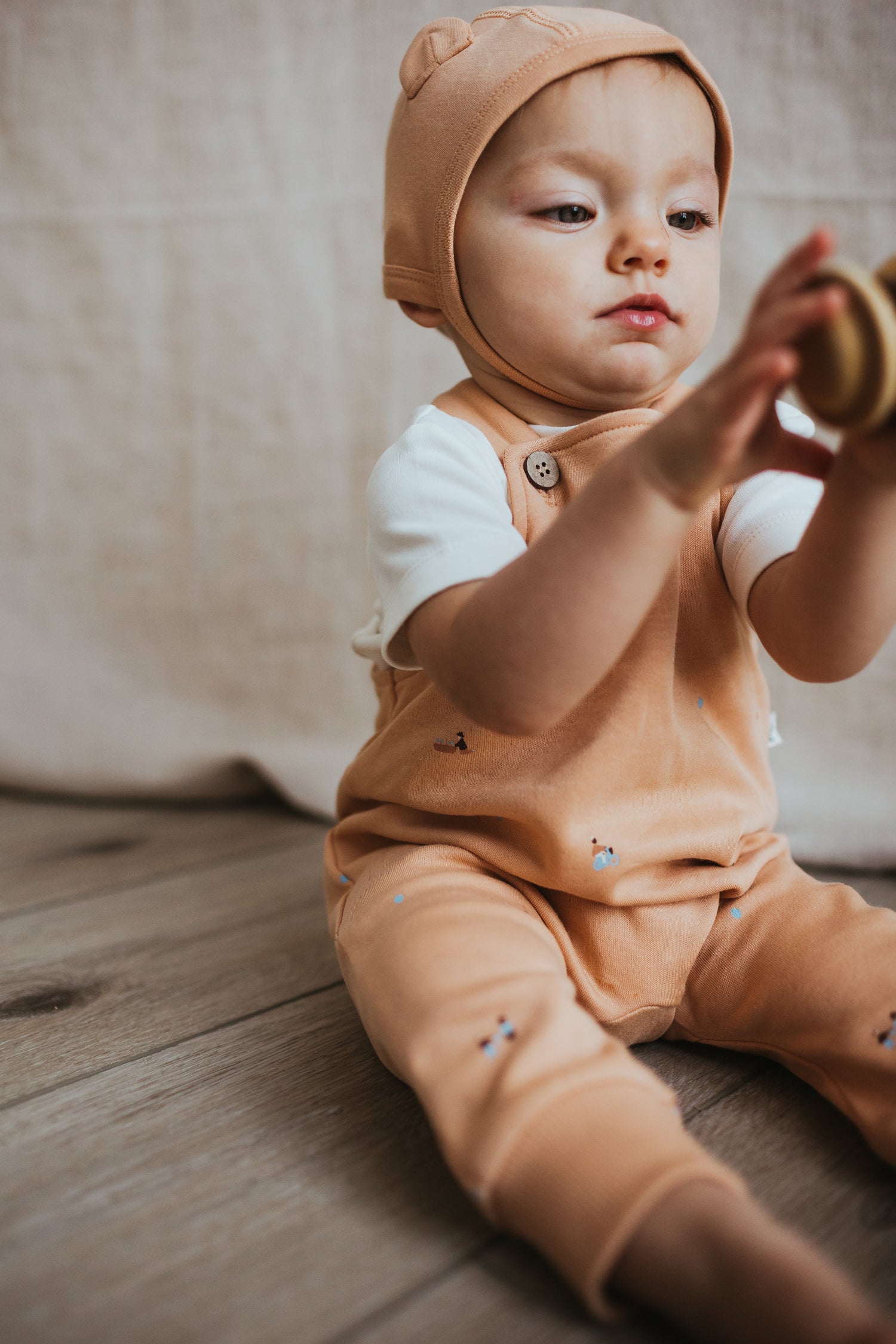 100% organic cotton bonnet in Clay with playful ears.