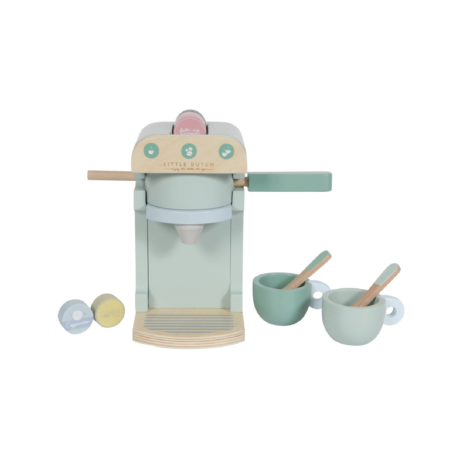 Children love to do grown-up things, such as making a nice cup of coffee. The Little Dutch wooden coffee machine is available in mint and includes two cups, two spoons and five flavours of coffee cups in nice colours: lungo, cappuccino, latte macchiato, coffee and espresso.